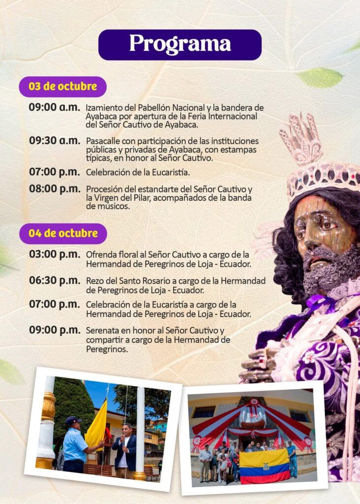 El programa oficial inicia este viernes 3 de octubre con el izado del Pabellón Nacional y la bandera de Ayabaca, seguido de un colorido pasacalle en el que instituciones públicas y privadas rendirán homenaje con estampas típicas. La jornada culminará con la Eucaristía y la procesión del estandarte del Señor Cautivo y de la Virgen del Pilar.