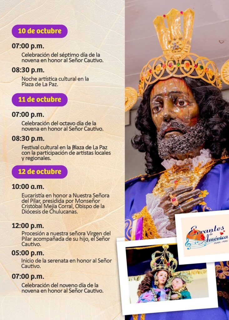 El día será el 12 de octubre, cuando se realice la solemne Eucaristía en honor a Nuestra Señora del Pilar, presidida por Monseñor Cristóbal Mejía Corral, Obispo de Chulucanas. Al mediodía, se desarrollará la esperada procesión de la Virgen del Pilar junto al Señor Cautivo, acompañados por miles de fieles que año tras año llegan hasta Ayabaca para renovar su fe y agradecer milagros.