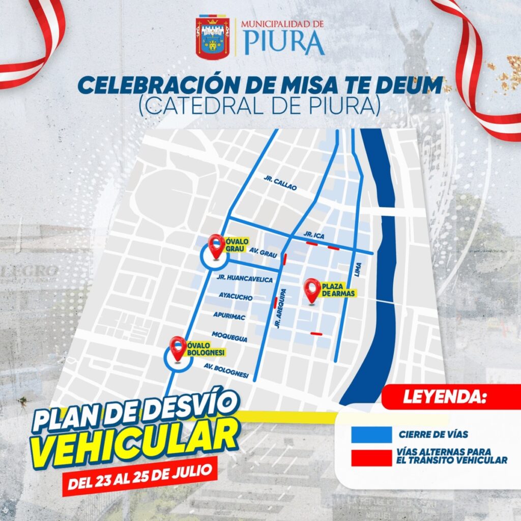 Con motivo del 204° aniversario de la independencia del Perú, la Municipalidad Provincial de Piura, ha dispuesto el cierre y uso temporal de vías públicas los días jueves 24 y viernes 25 de julio, a fin de asegurar el desarrollo ordenado y seguro de las actividades protocolares y festivas.