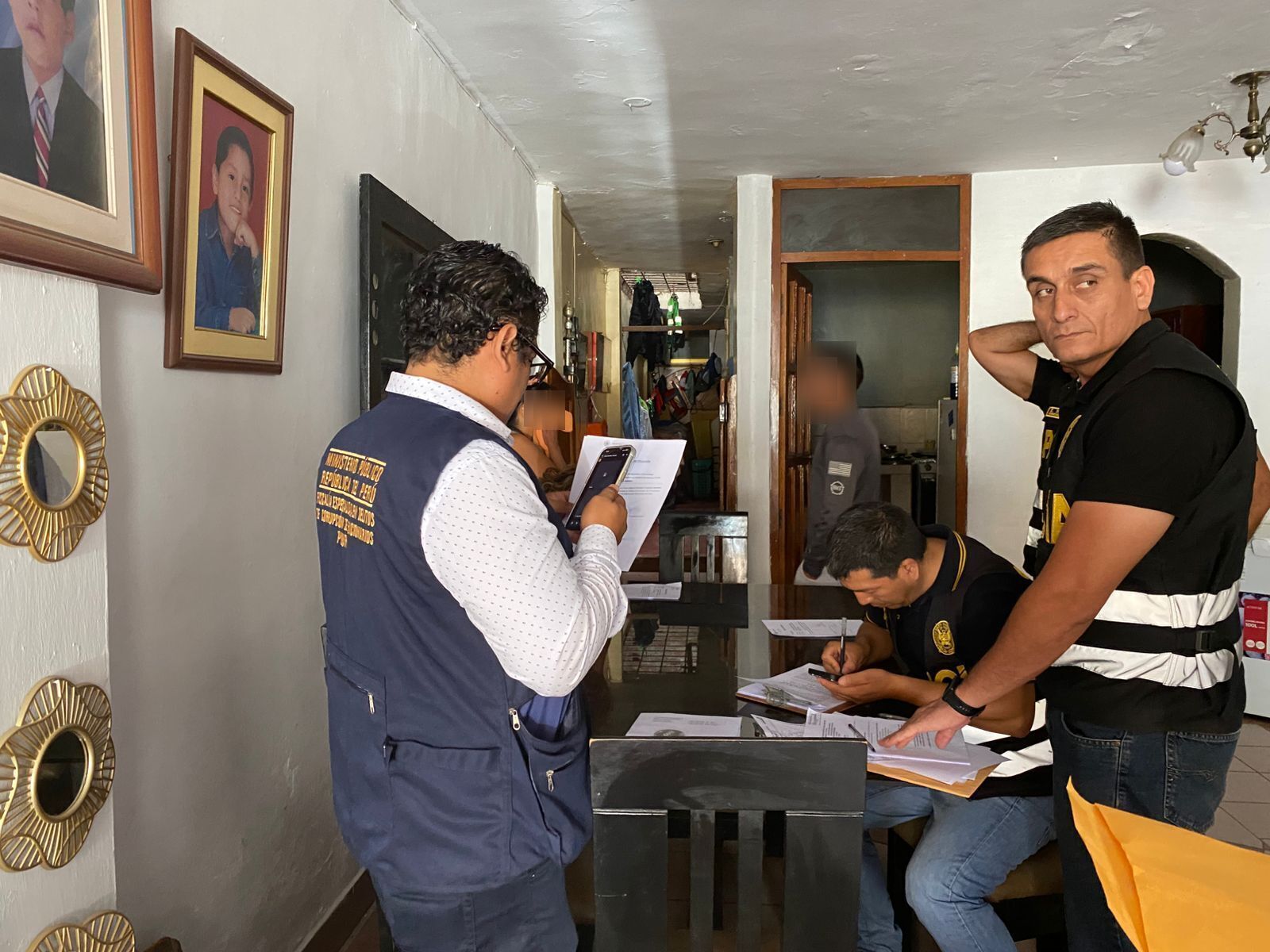 La intervención estuvo a cargo del Tercer Despacho de la FECOF Piura, que realizó allanamientos simultáneos con descerraje, registro domiciliario y levantamiento del secreto de las comunicaciones en cuatro inmuebles, vinculados a tres efectivos policiales y un civil implicado en el caso. La diligencia estuvo a cargo de la fiscal provincial Fyorella Montero Talledo.