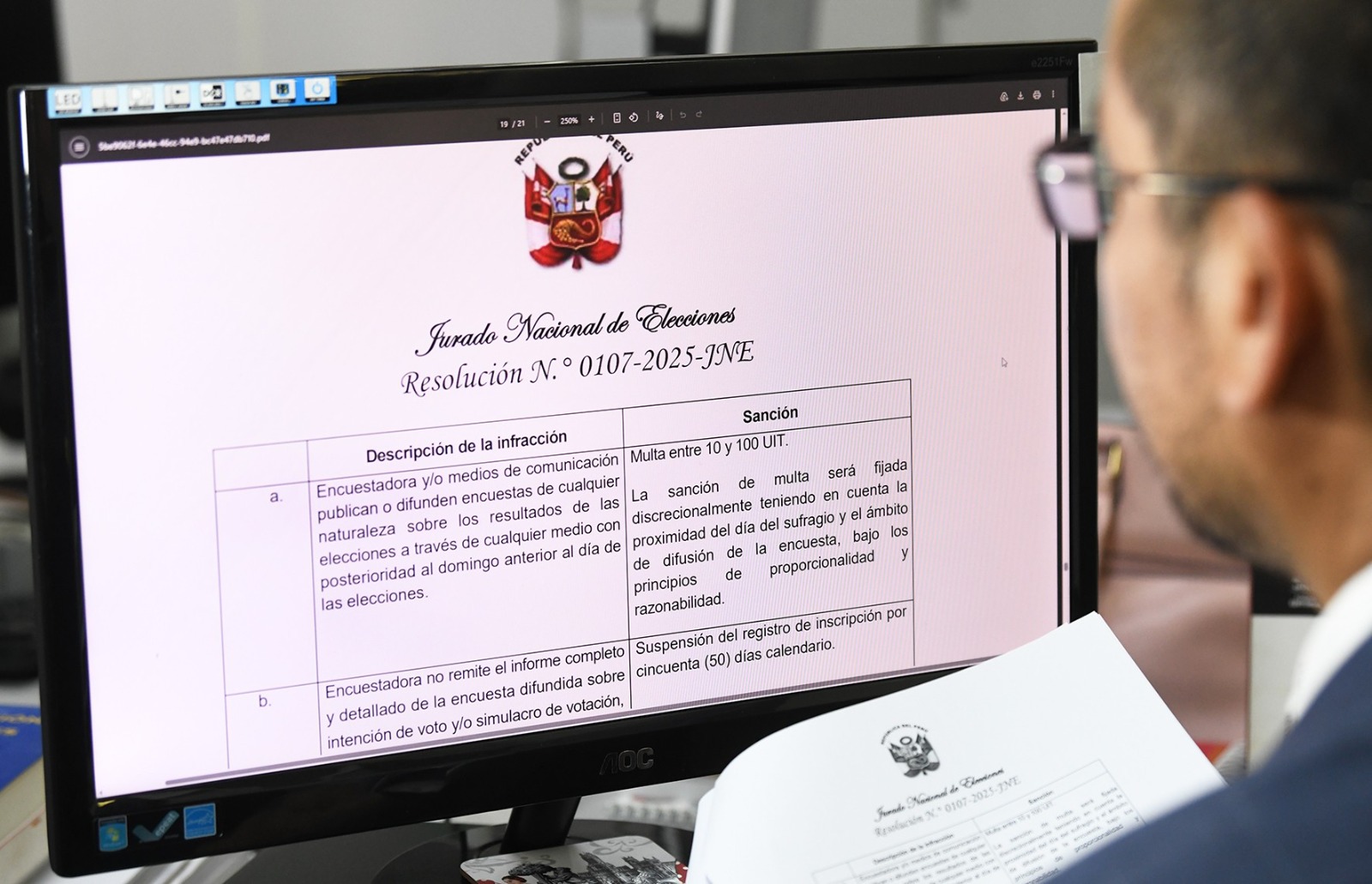 En el contexto de las Elecciones Generales 2026, el Jurado Nacional de Elecciones (JNE) advirtió que las encuestadoras y los medios de comunicación que difundan encuestas electorales fuera del plazo permitido por ley serán sancionados con severas multas económicas, además de suspensiones y la cancelación de su inscripción en el Registro Electoral de Encuestadoras (REE).
