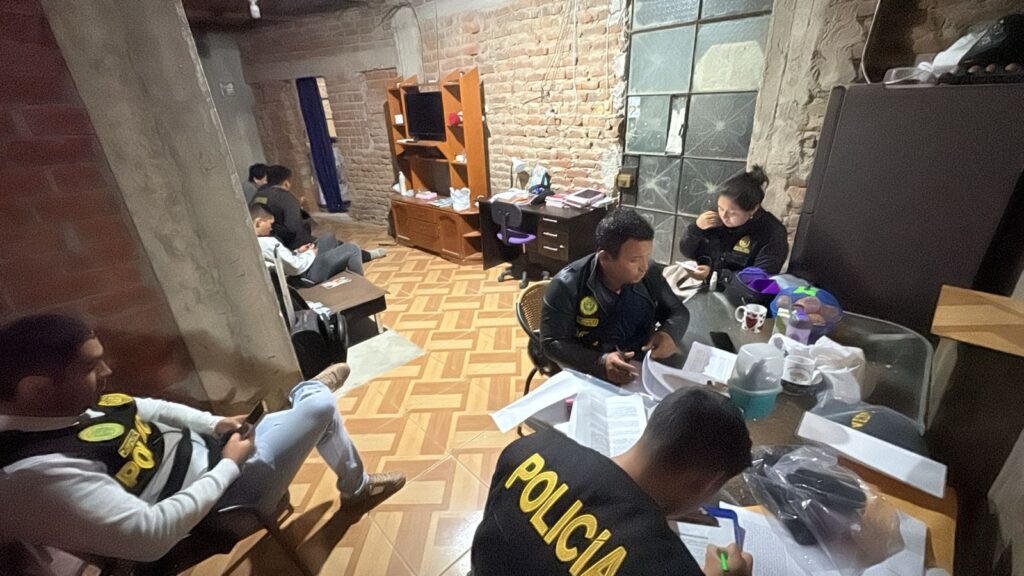El operativo, dirigido por el fiscal provincial Orlando Urbina Cerqueira, se realizó tras una minuciosa labor de inteligencia que permitió obtener las órdenes judiciales de allanamiento y descerraje. Durante la intervención, se incautaron teléfonos celulares, laptops, documentos con información de cuentas bancarias y otros elementos que ahora son clave en la investigación.