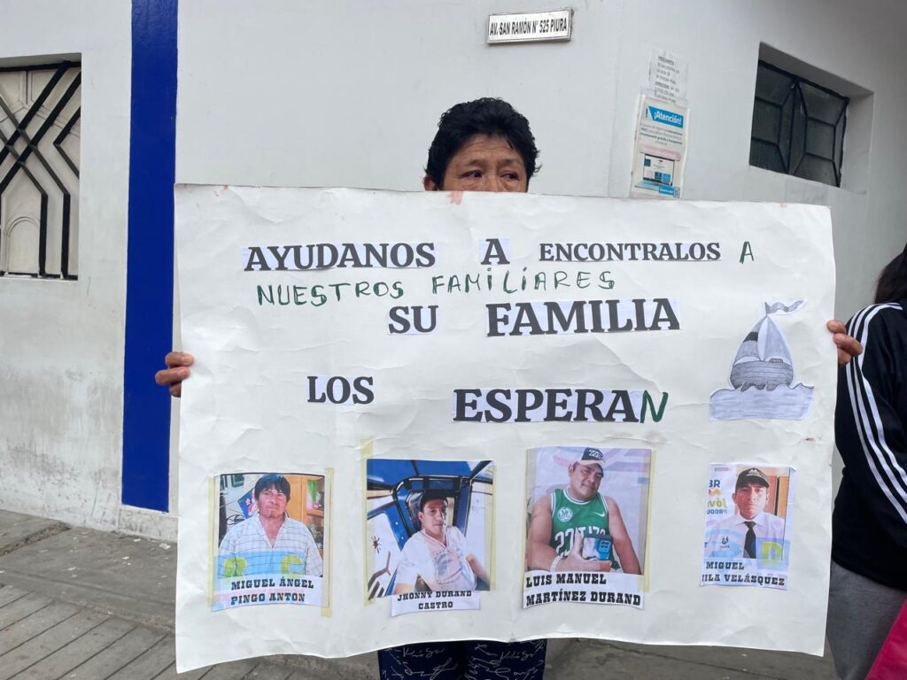 Con el dolor reflejado en el rostro y pancartas en mano, familiares de tres pescadores del distrito de Bernal, en la provincia de Sechura, protestaron la mañana de este miércoles 18 de junio en los exteriores del Gobierno Regional de Piura para exigir acciones concretas en la búsqueda de sus seres queridos, desaparecidos en altamar desde hace 52 días.