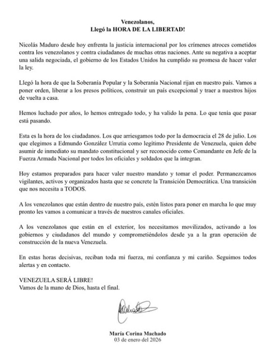 Machado afirma que es el momento de que “la Soberanía Popular y la Soberanía Nacional rijan en el país”, con el objetivo de restablecer el orden, liberar a los presos políticos, reconstruir la nación y propiciar el retorno de los venezolanos que emigraron. “Hemos luchado por años, lo hemos entregado todo y ha valido la pena. Lo que tenía que pasar está pasando”, expresó.