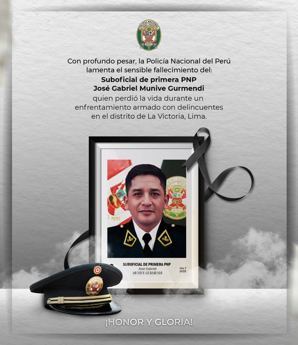 Una violenta balacera registrada la noche del domingo 3 de agosto en el distrito limeño de La Victoria dejó como trágico saldo la muerte del policía José Gabriel Munive Gurmendi y varias personas heridas, entre ellas su compañero de patrullaje, el agente Harry del Carpio Valdez, y una menor de edad que se encontraba comprando en una tienda cercana al lugar de los hechos. Los agentes habrían frustrado un asalto a un camión cargado de abarrotes perpetrado por delincuentes que se movilizaban en una motocicleta, en el cruce de los jirones Italia y San Pablo.